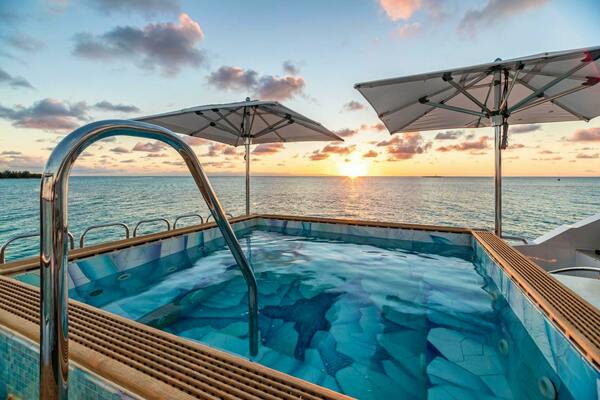 Sun deck features a custom, waterfall pool for 12 guests, dayhead, L-shaped bar, BBQ, large alfresco dining table, and plentiful sunpads and lounging areas.